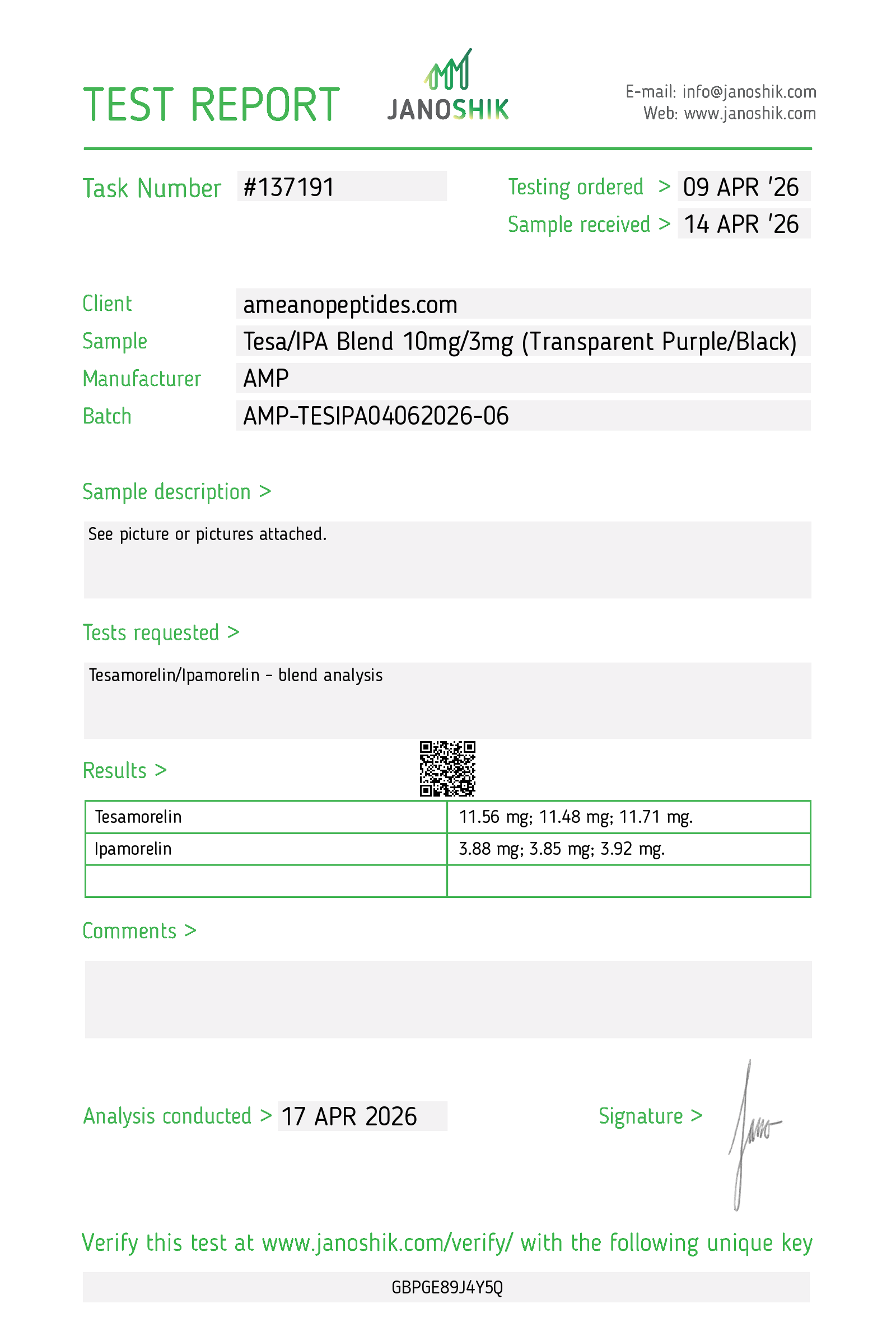 Below is a list of lab test results for each of our research peptides. Each COA is verified by an independent third-party lab to ensure purity and accuracy.