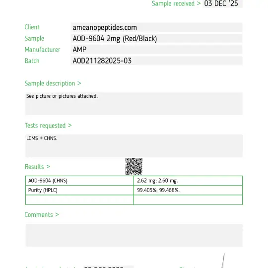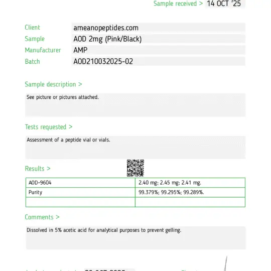 AOD-9604 – 2mg is offered by AMP for qualified research professionals and laboratory use. This peptide is provided in a lyophilized format with a high purity specification.