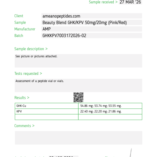 Beauty Blend (GHK-Cu/KPV) is a research-use-only blend supplied as a lyophilized material in a single vial. This product is offered strictly for qualified laboratory and scientific research applications where permitted by law.
