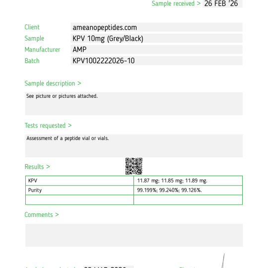 KPV is a synthetic tripeptide composed of lysine, proline, and valine. It is provided in lyophilized powder form and is intended strictly for laboratory-based in vitro research conducted by qualified professionals.