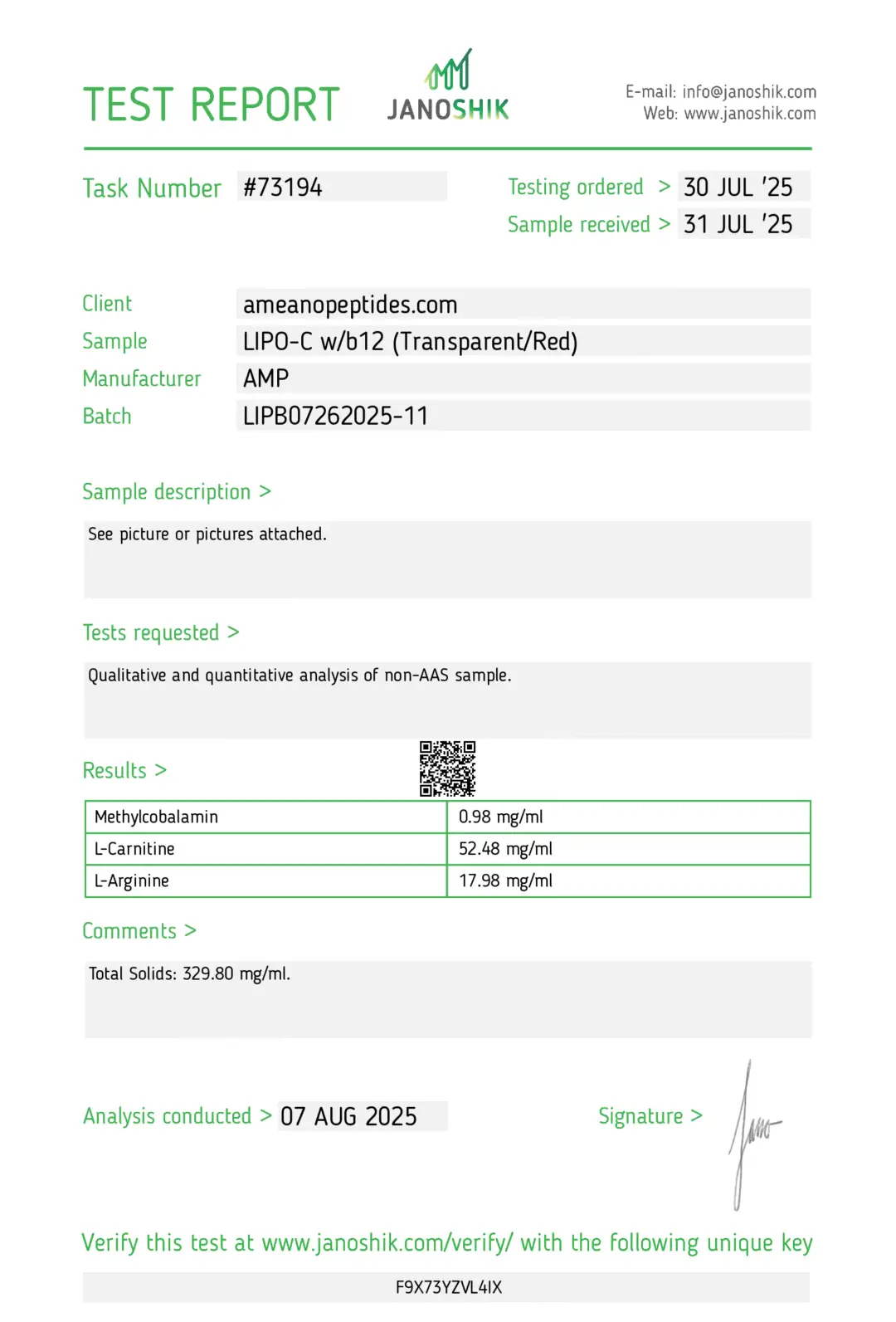 LIPO-C with B12 is a laboratory-use formulation containing a blend of compounds, including Methylcobalamin (Vitamin B12). This sterile, aqueous solution is supplied in a 10ML vial and is intended strictly for use in controlled, non-clinical research environments.